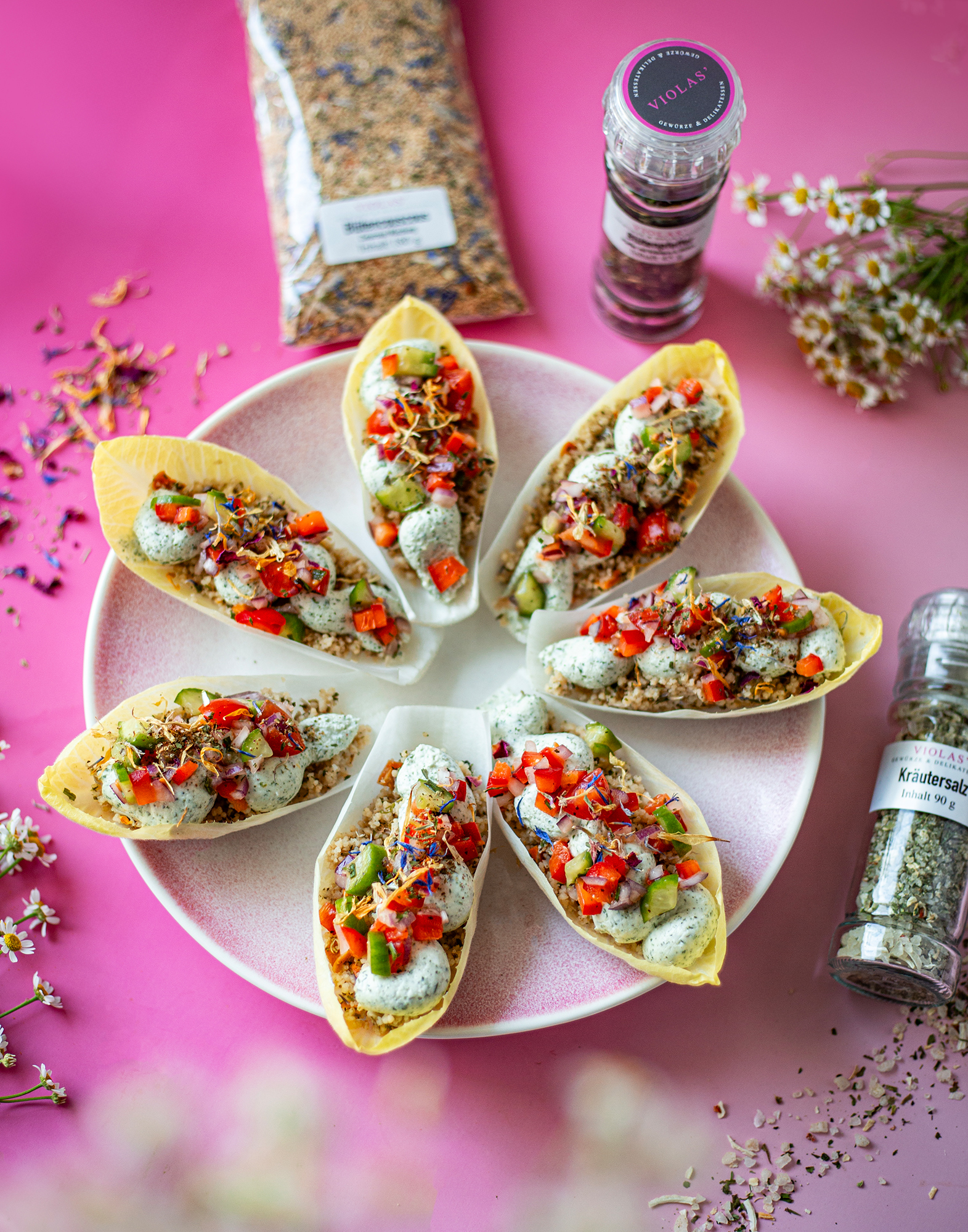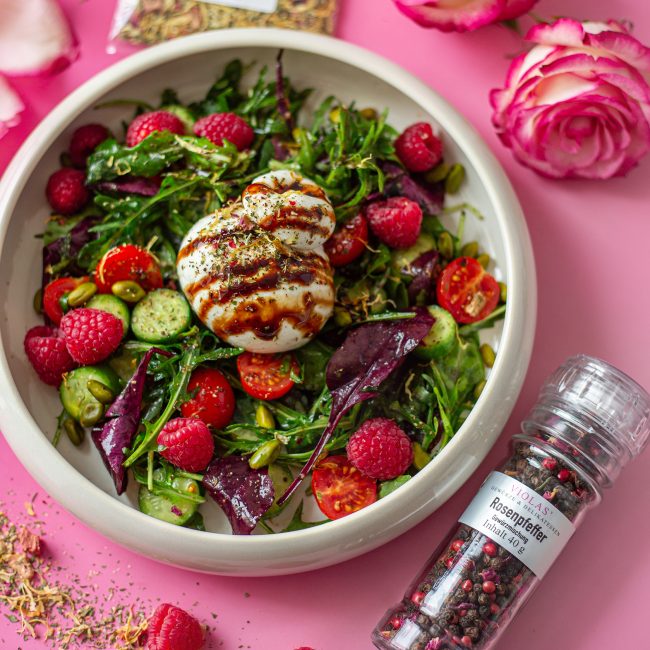 Himbeer-Burrata-Pinsa mit essbaren Blüten