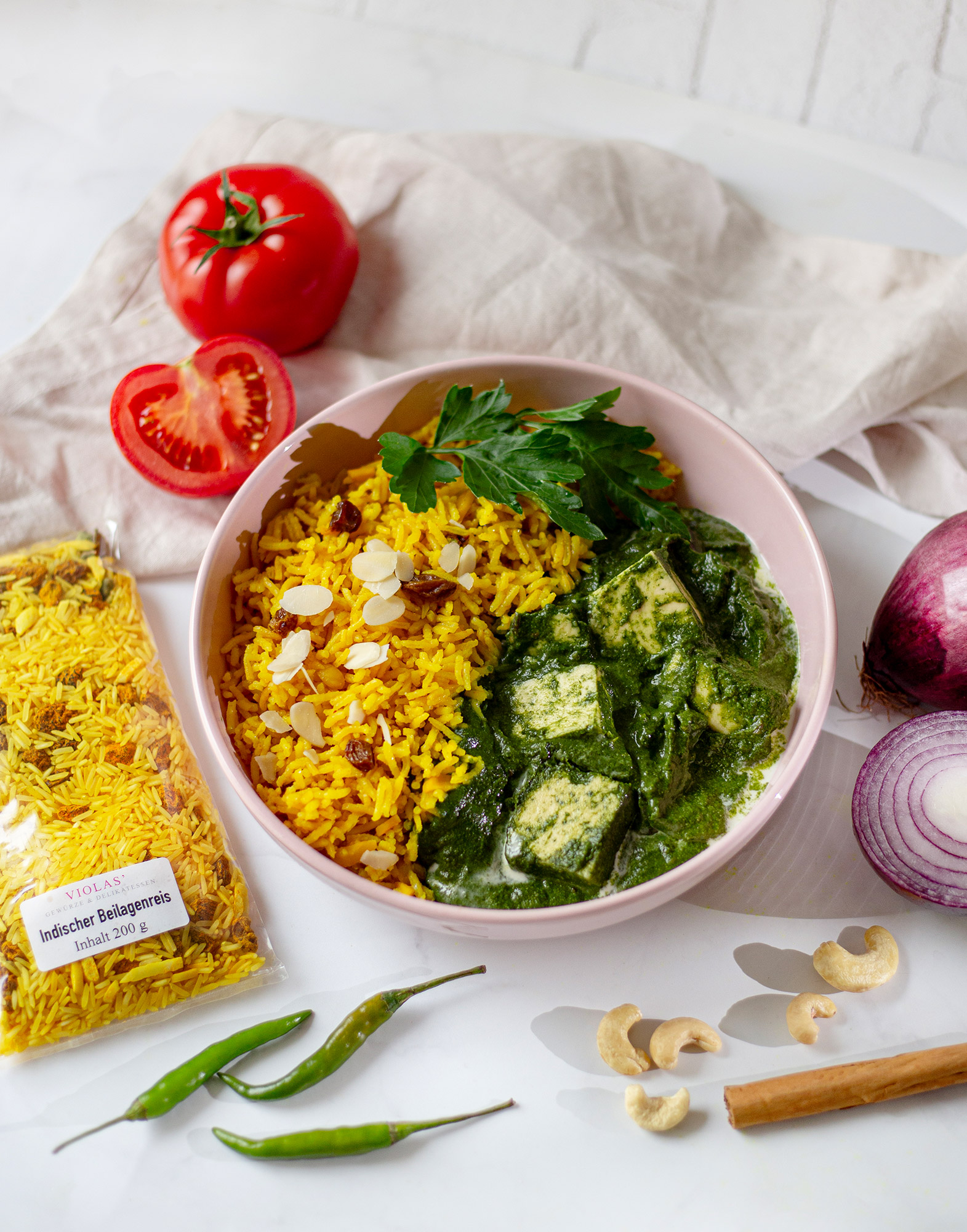 Palak Paneer ist ein klassisches nordindisches Gericht, das seinen Ursprung in der Region Punjab hat. Dort spielen sowohl Spinatgerichte als auch Milchprodukte traditionell eine große Rolle. So entstand die Kombination aus „Palak“ (Spinat) und „Paneer“ (frischer indischer Käse). Heute ist Palak Paneer eines der bekanntesten indischen Gerichte weltweit und in vielen Restaurants erhältlich. Bei VIOLAS’ finden Sie neben Gewürzmischungen auch viele Einzelgewürze, mit denen Sie indisch inspirierte Gerichte ganz einfach zu Hause nachkochen können.