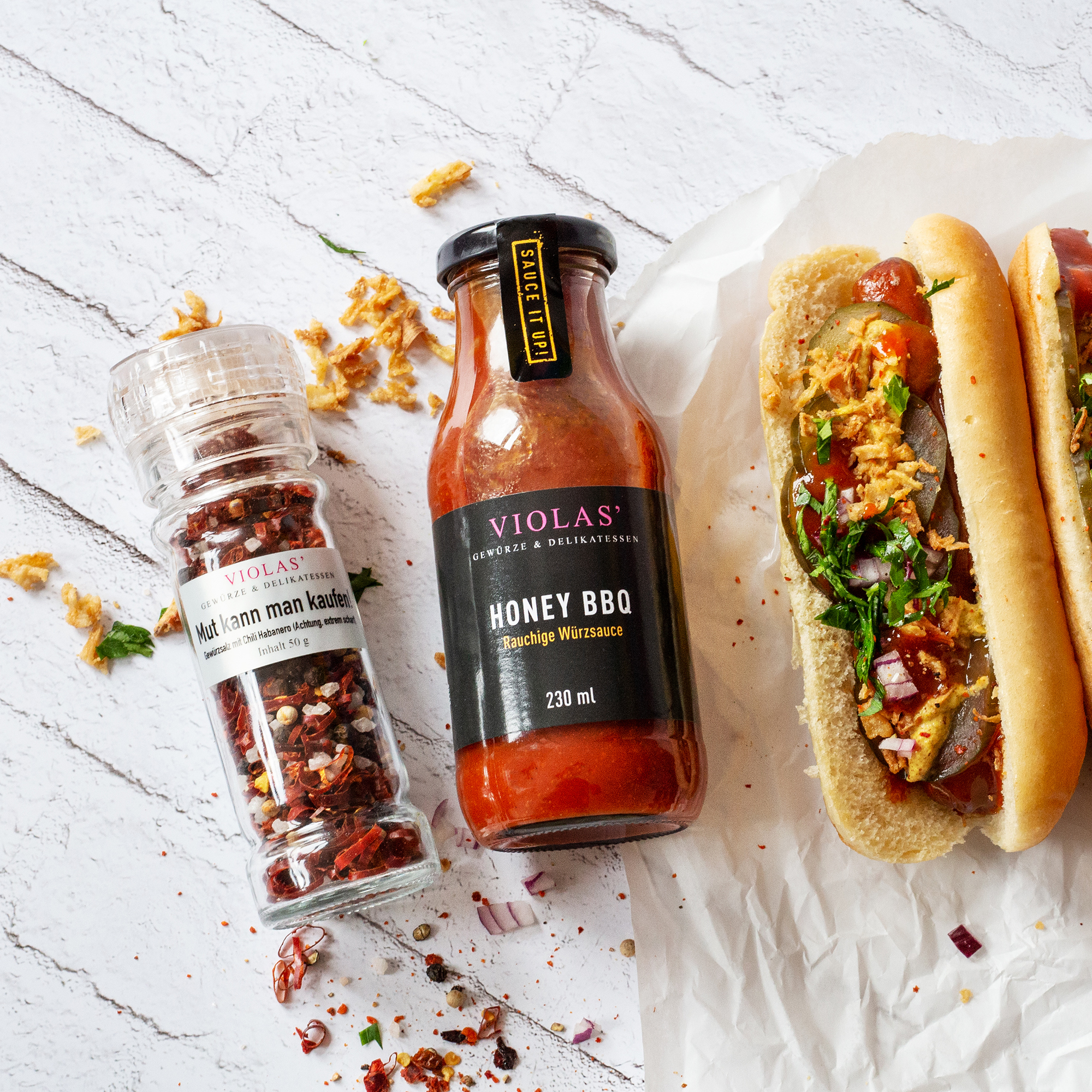 Für die besondere Würze verwenden wir hier unsere »Honey BBQ« Sauce sowie für den extra Schärfe-Kick unsere Mühle »Mut kann man kaufen«, mit echtem Chili Habanero.