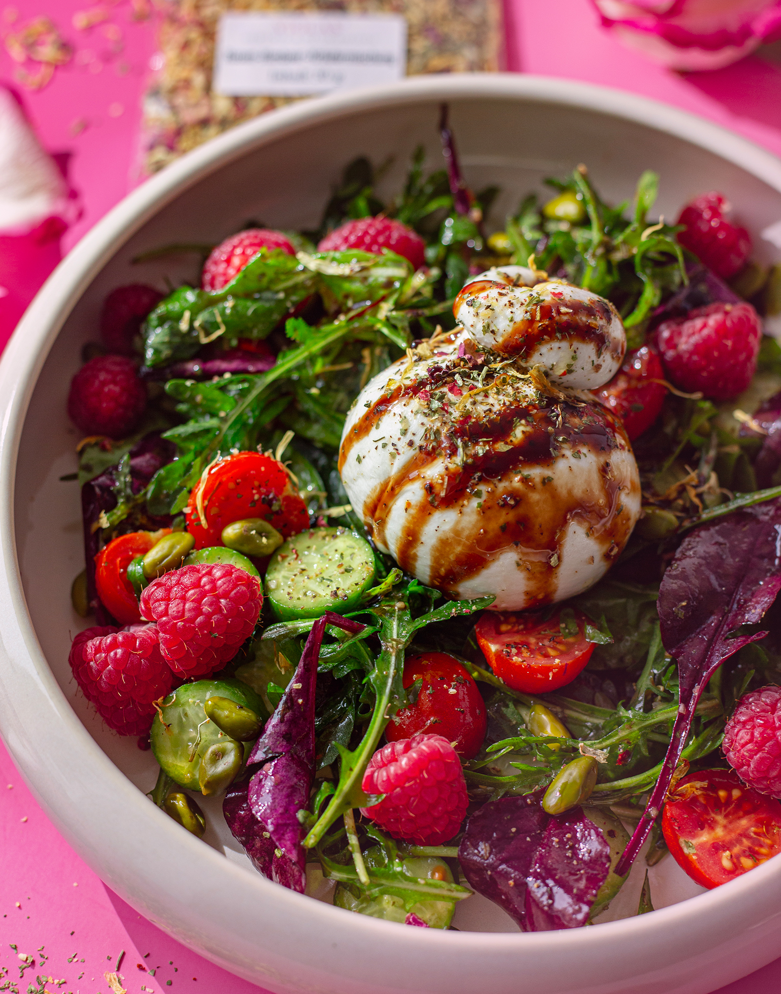 Fruchtige Himbeere trifft feine Rosen-Note und cremige Burrata: Dieser Salat ist schnell gemacht, sieht nach „Wow“ aus und schmeckt nach Frühling. Perfekt als leichter Lunch, als Vorspeise fürs Oster-Menü oder als Highlight auf dem Brunch-Buffet. Die Kombi aus süß, herb, cremig und crunchy (Pistazien!) macht ihn richtig rund.