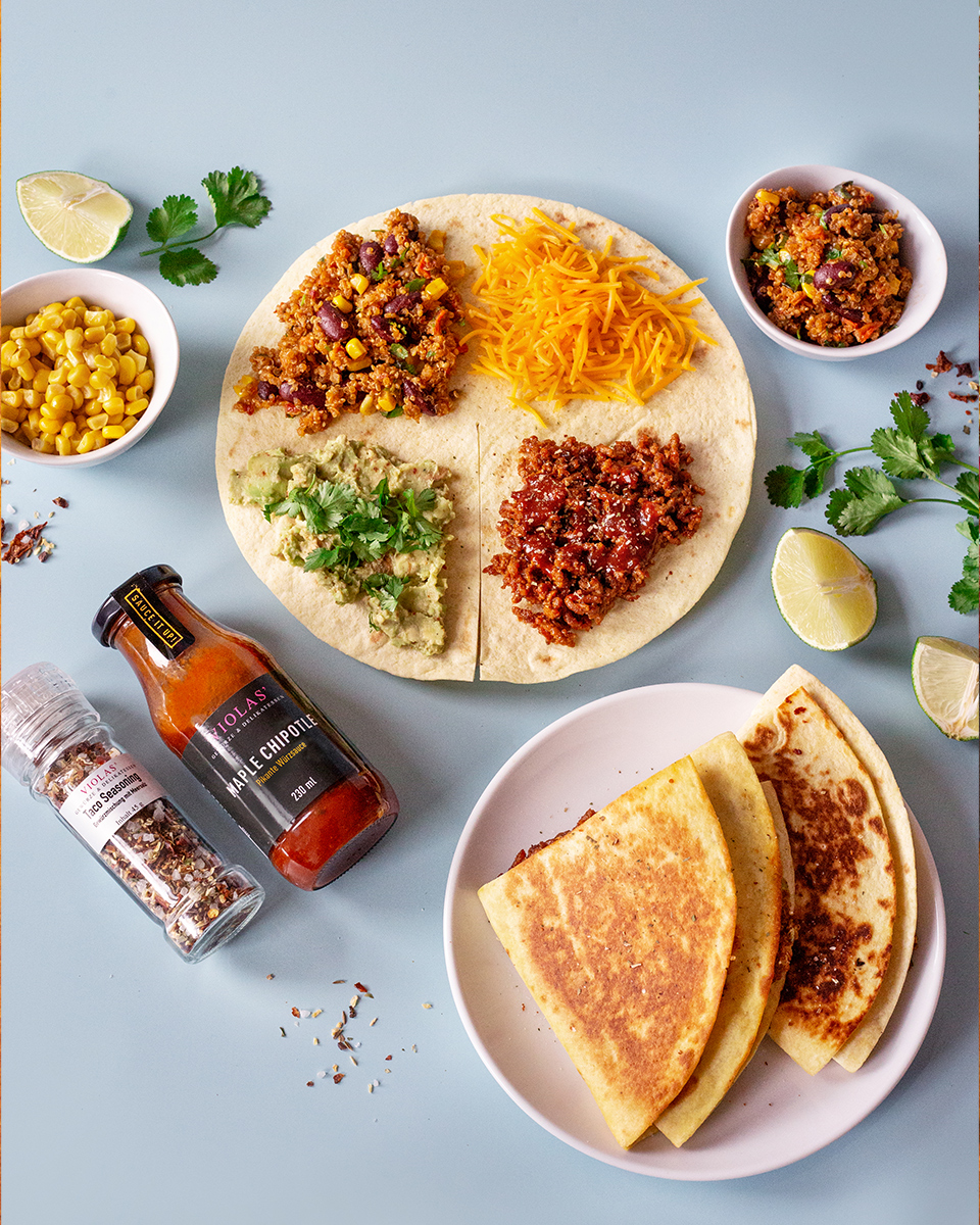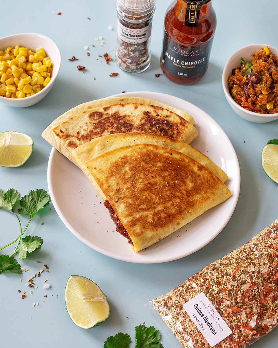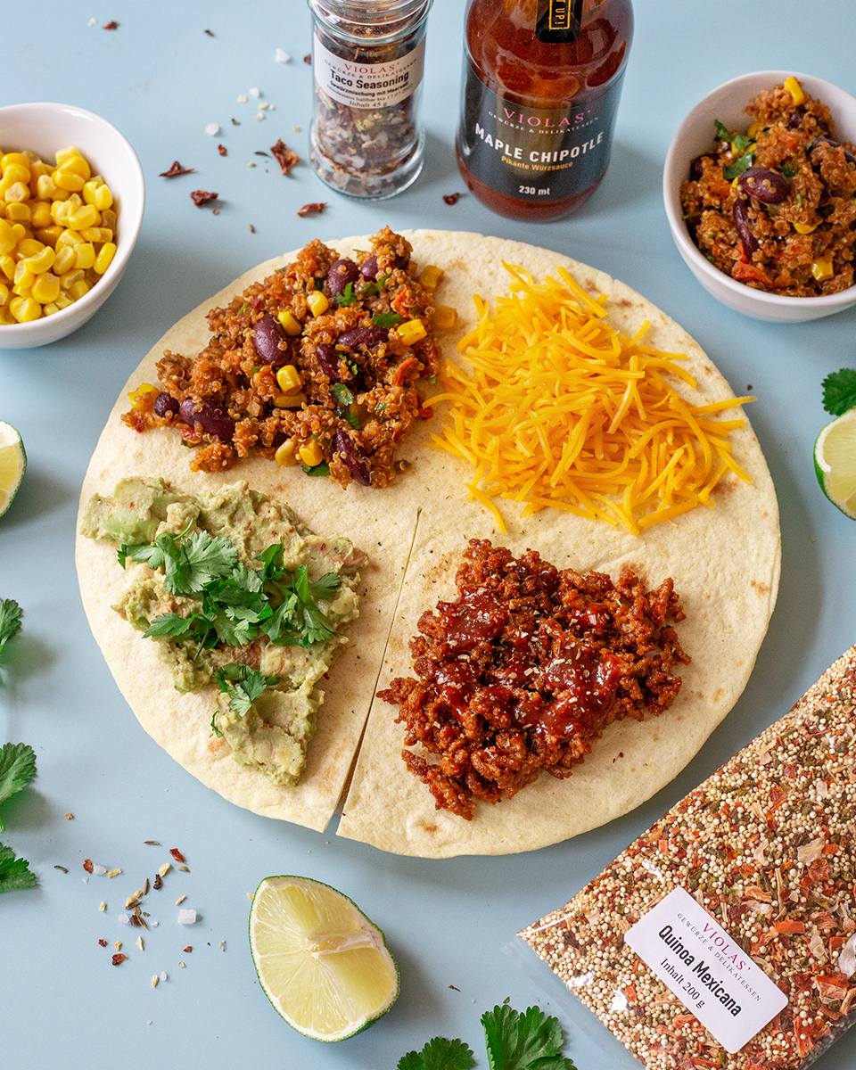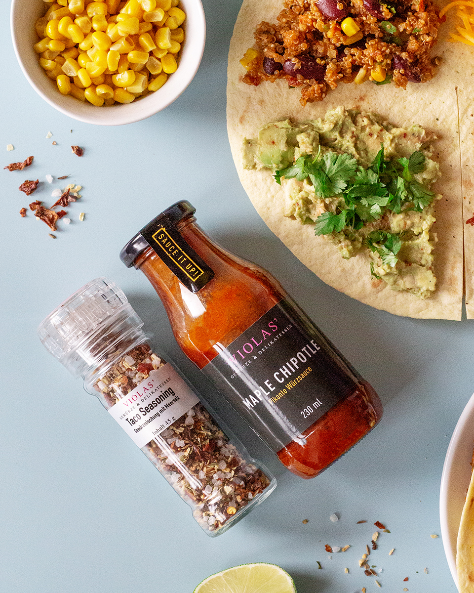 Hackfleisch in etwas Öl anbraten und mit VIOLAS' »Taco Seasoning« würzen. Im Anschluss einen ordentlichen Schuss VIOLAS' »Maple Chipotle« unterheben.